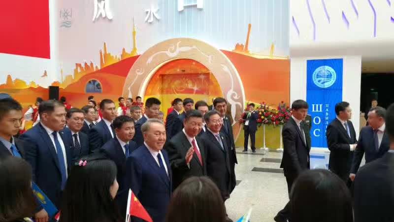 2017年6月8日,国家主席习近平在哈萨克斯坦总统纳扎尔巴耶夫陪同下,参观阿斯塔纳专项世博会中国国家馆。